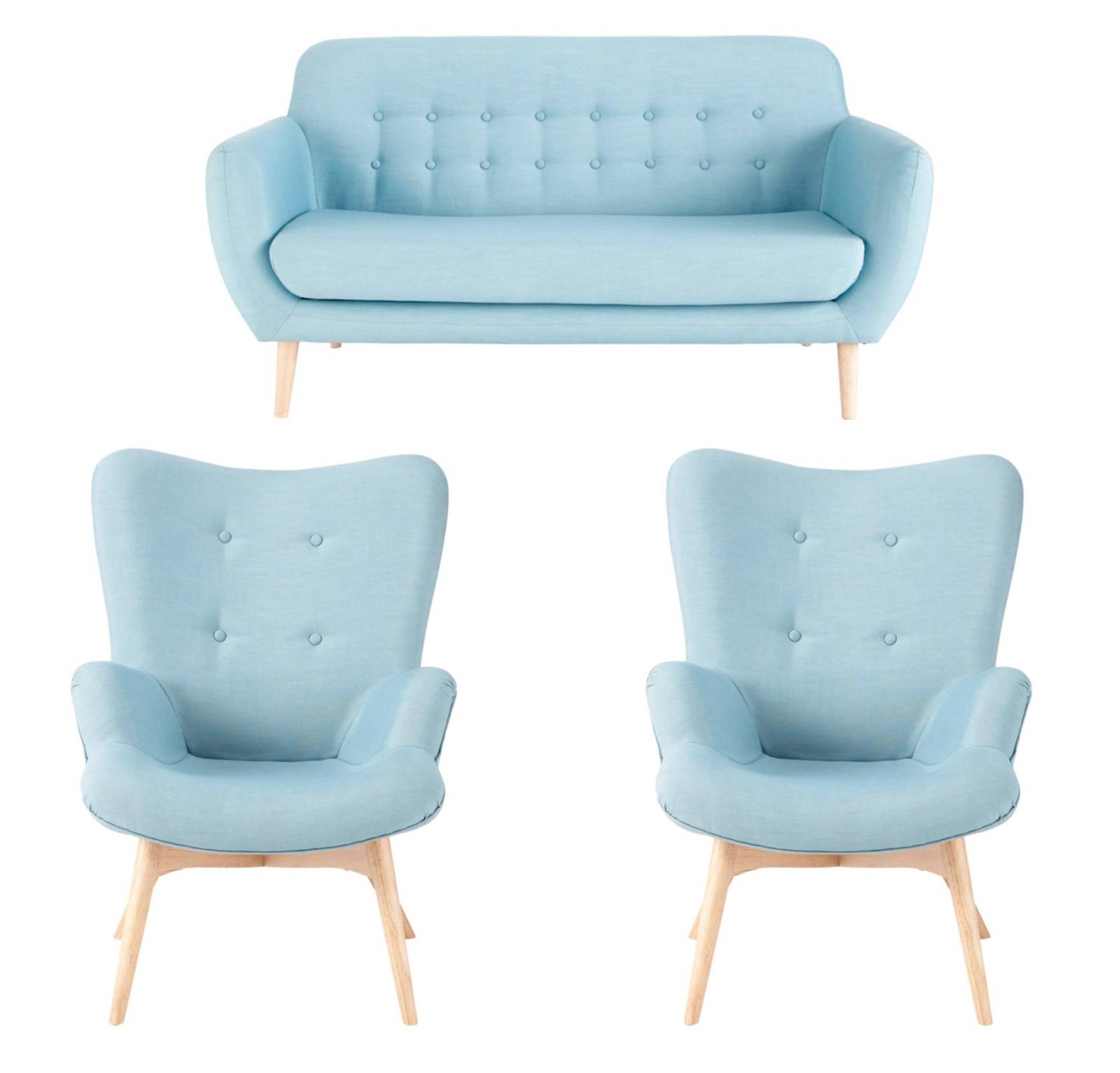 Un design romantique associé à une assise très confortable ! Le pack mobilier Copenhague bleu ciel avec pieds en bois comprend un canapé bleu ciel 2 places L.160 x P.78 x H84 cm et de 2 fauteuils bleu ciel en tissu.