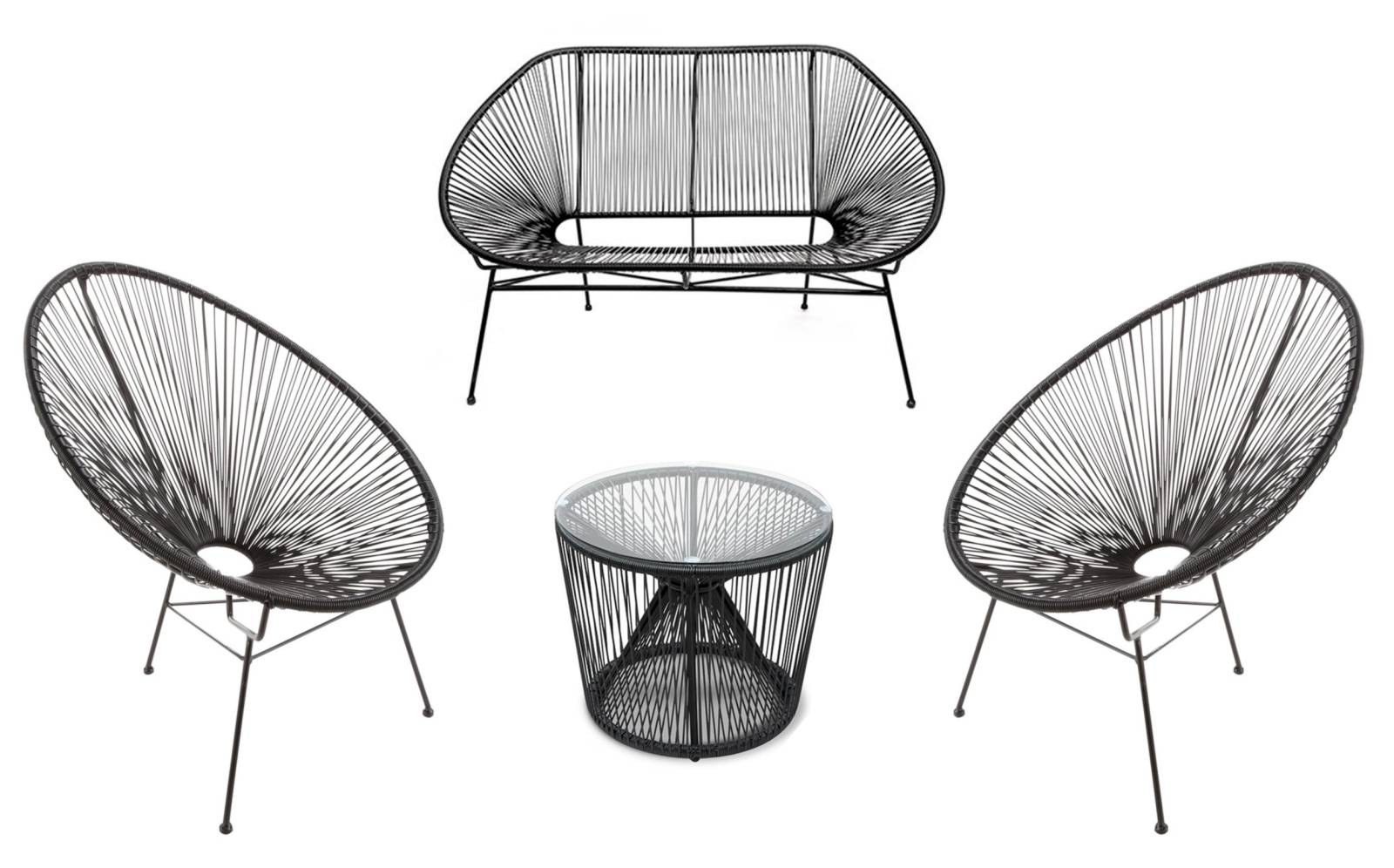 Le pack mobilier Panama comprend un canapé Panama noir L.122 x l.78 x H.97 cm, une table basse Panama noire, et de 2 fauteuils noirs en pvc tressé.
