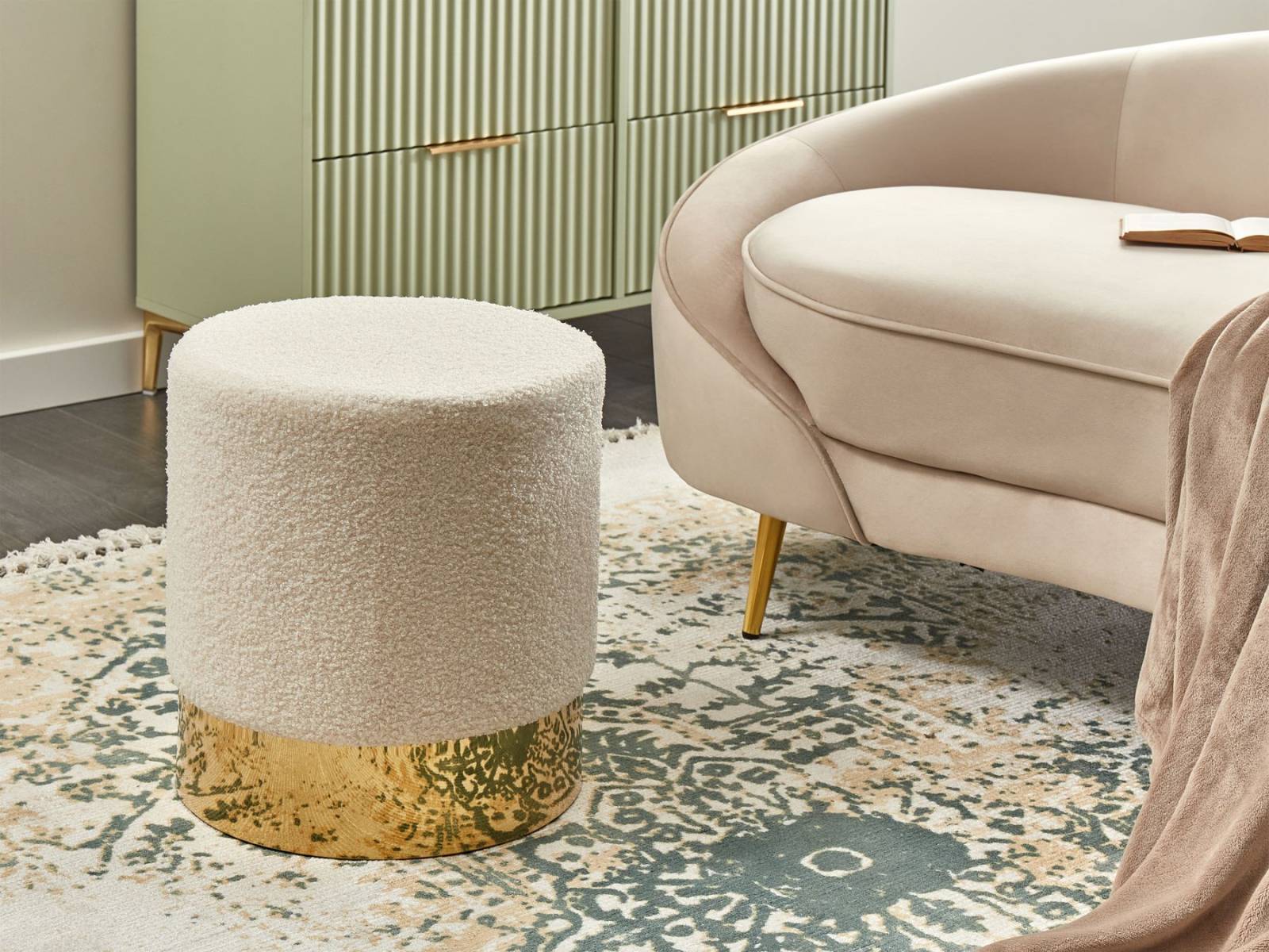 Doux et design, le pouf bouclette en location dans le 75 confère à l'aménagement mobilier un aspect très cosy, romantique. Ce tabouret bas en bouclette blanc à louer à Paris est disponible en velours bleu vert, ROSE, JAUNE et NOIR.